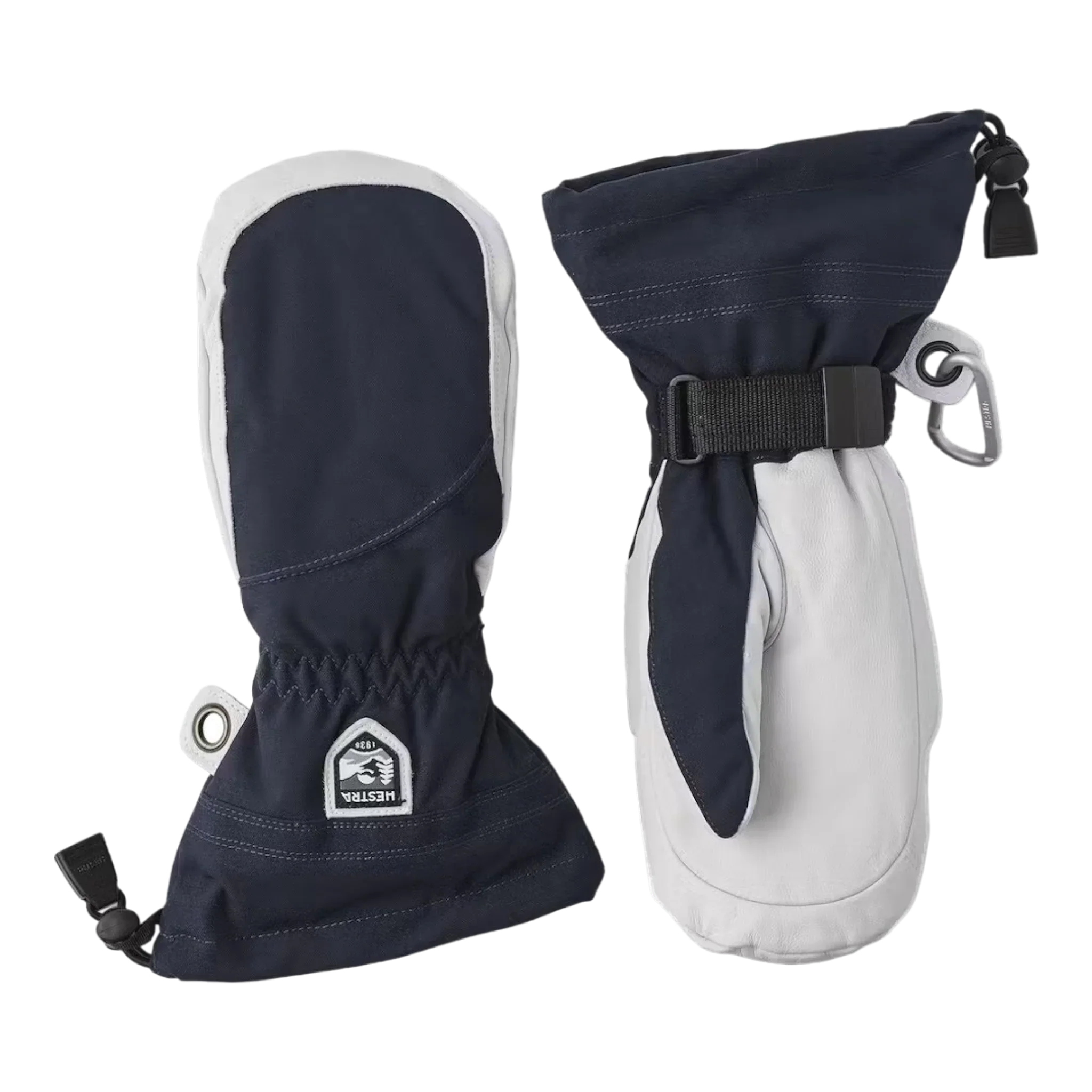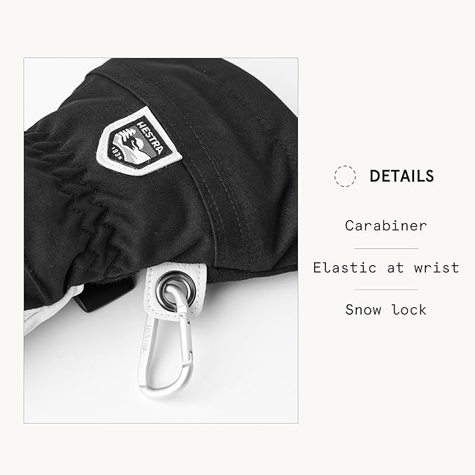 Hestra's Army Leather Heli Ski was originally created for ski guides in western Canada who needed a reliable and warm ski glove for long, cold days in the snow. This women's mitten has a narrower cut to fit women's narrower hands. Like all mitten versions, it provides plenty of space for the fingers, making it warmer than the equivalent glove. The outer glove is sewn in a hardwearing, weather-resistant combination of goatskin leather and 3-layer polyamide fabric. A range of smart functions come in handy when you can't head indoors to warm up that often. For example, the liner is easy to remove and dry, or replace with a thinner inner glove when you're being more active and hiking uphill. In powder snow, the long cuff with snowlock and wrist adjustment keep the snow on the outside and the warmth on the inside. A wrist strap reduces the risk of dropping a glove if you take it off to adjust your equipment or use your phone. And the included carabiner means you can hang the glove up with its opening facing downwards – practical while you're wearing just a thinner liner and want to avoid your gloves filling up with snow. A durable, flexible companion for skiers that spend a lot of time outdoors and who often find themselves far from the ski resort and its comforts.