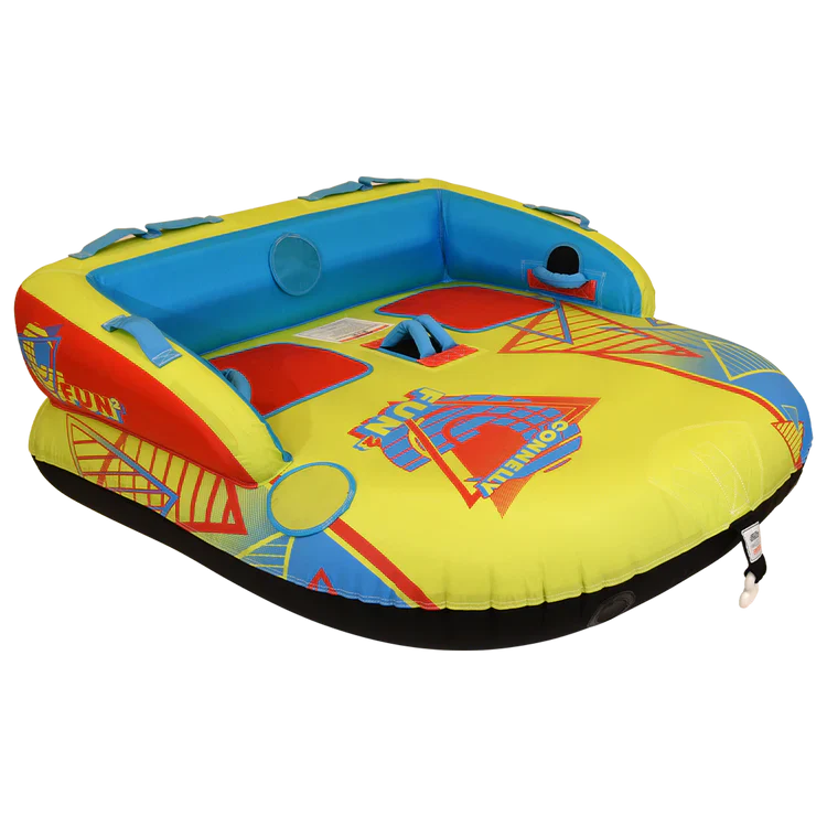 The Fun 2 towable tube is perfect for 2 riders, offering both laid-back couch or kneel chariot styles for action-packed fun. Measuring 65” x 65”, it features Two-Way Tow technology for versatility. Made from durable 420D nylon with a heavy-duty bladder, it includes soft EVA seats, padded handles, grab straps, quick inflation via Boston valve, and a mesh drain bottom. Comes with a repair kit and a 1-year warranty.